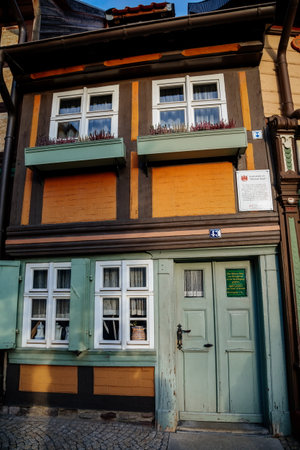 Wernigerode, Saxony-Anhalt, Germany, 29 October 2022: Krummelsches Haus or Krummel's house, Historic old vintage colored timber frame houses with carvings in medieval town, home at sunny day