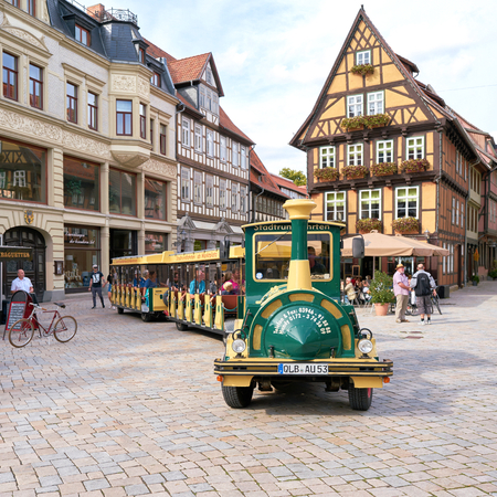 QUEDLINBURG, GERMANY - SEPTEMBER 08, 2018: Tourists during a city tour through the Old Town of Quedlinburg with a locomotive