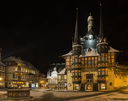Night view of the Old Town Hall Square in Quedlinburg, Germany