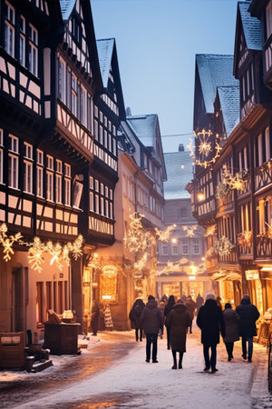 Decorated Street in a Christmas night in an old town. People are walking