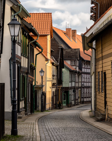 Wernigerode, Saxony-Anhalt, Germany, 29 October 2022: Historic old vintage colored timber frame houses in medieval town, UNESCO World Heritage city, half-timbered home at sunny autumn day, cobblestone