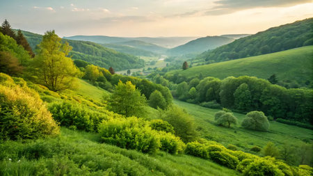 Beautiful summer landscape with green meadows and forest on hillside
