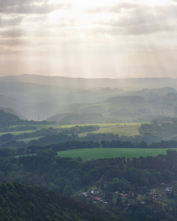 Amazing morning scenery. The first rays of the sun fall on green fields, mountains. National Park Saxon Switzerland, Germany. Morning foggy atmosphere