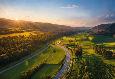 Dusk showing serpentine river and highway carve through lush green valleys dotted with small villages during a golden sunset with warm light keywords: river,...