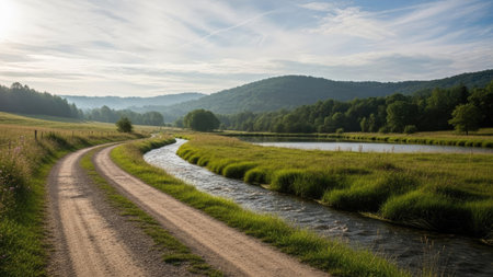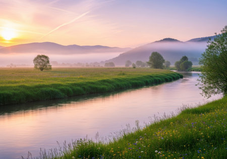 Serene sunrise over tranquil river valley