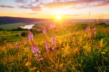Splendid blooming meadow near the Dniester river at sunset. Location place Dnister canyon of Ukraine, Europe. Clouds illuminated by the beams of the sun. Photo wallpaper. Discover the beauty of earth.