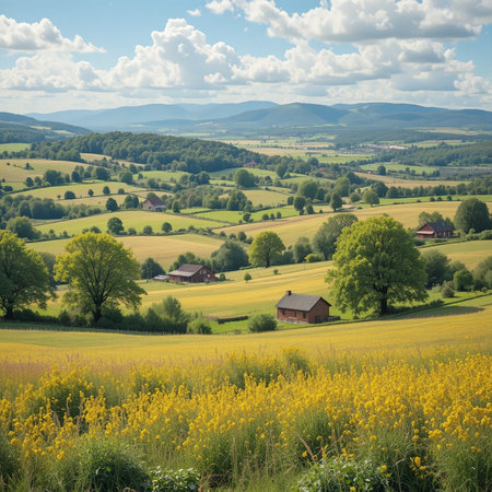 A picturesque countryside landscape featuring rolling hills, lush green fields, and quaint farmhouses. The scene is framed by vibrant yellow wildflowers in the foreground, with a clear blue sky dotted with fluffy white clouds overhead. The distant mountains add depth to the tranquil and idyllic setting.