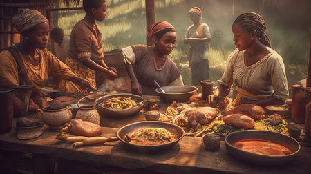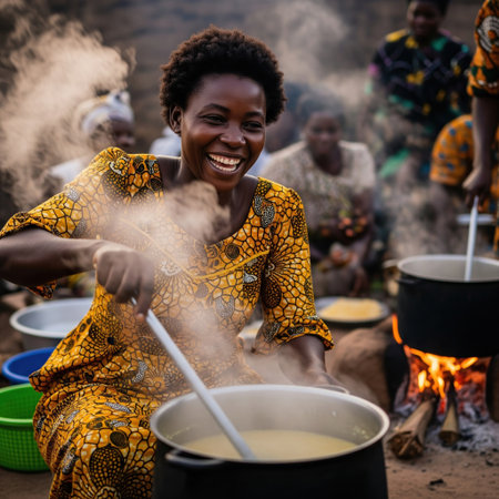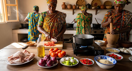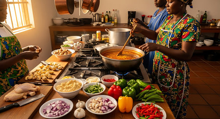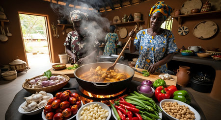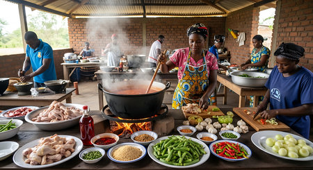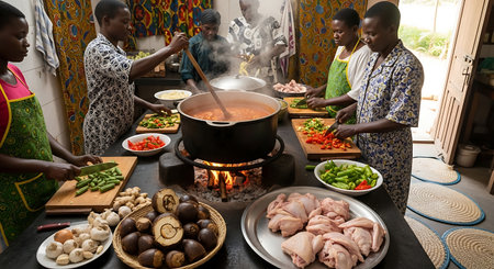 African chefs in a professional kitchen are skillfully preparing sweet potato broth and other traditional dishes, demonstrating their cultural culinary expertise