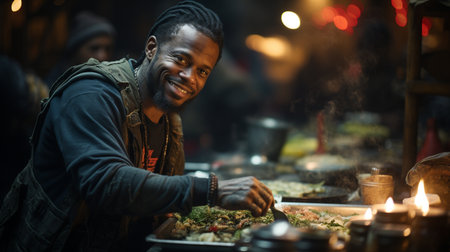 Happy attractive African woman cooking food on street market and smile to camera. Travel, food, holidays concept