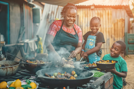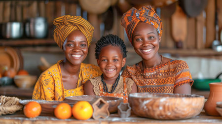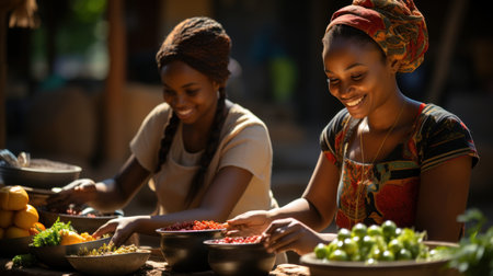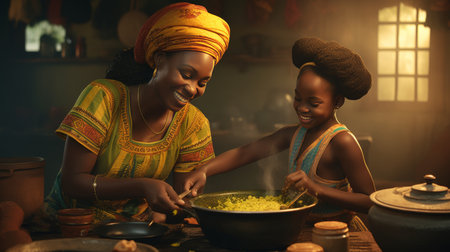 Happy African mother teaching her daughter to prepare a traditional family food, generation concept