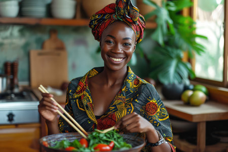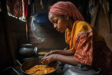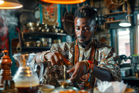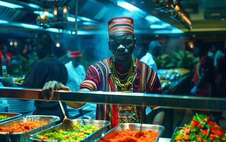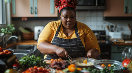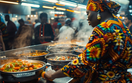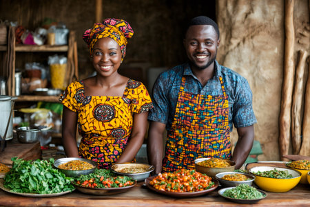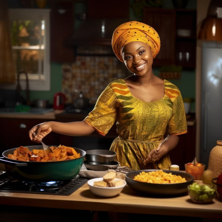 A skilled cook is joyfully crafting traditional meals in a rustic kitchen. Brightly colored spices and grains are neatly arranged, showcasing the vibrant cuisine. The atmosphere is warm, reflecting a passion for cooking and cultural heritage.
