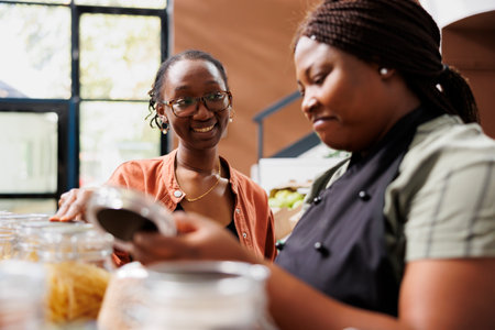 Young African American woman in an apron offering sustainable bio food products to her happy customer. Storekeeper in locally grown market, promoting eco friendly meal recipes from fresh ingredients.