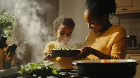 A mother teaches her child how to cook in a cozy kitchen filled with steam and fresh ingredients during a bright afternoon
