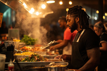 Culinary delights chef prepares street food urban food festival vibrant night market close-up view flavorful experience
