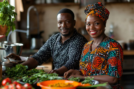African man and woman in traditional clothes cooking soup in the kitchen.