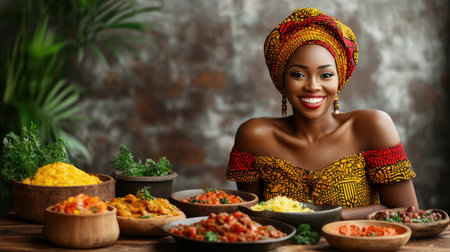 A joyful woman in traditional attire beams at the camera while seated at a rustic table. Surrounding her are colorful bowls filled with diverse African dishes, creating an inviting atmosphere that showcases rich culinary heritage.