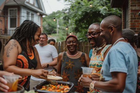People from different communities sharing stories and laughter at a neighborhood potluck, fostering bonds and resilience. --ar 3:2 --v 6 Job ID: 45764540-72a2-45f3-9e86-00e7b23b1638