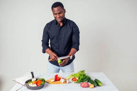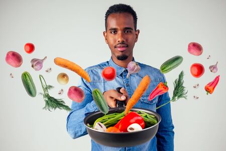 young black man cooking at home domestic kitchen and preparing a vegetarian meal.vegan food on white background in studio