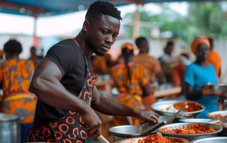 A vendor in colorful attire serves a steaming portion of rice, showcasing vibrant spices and ingredients at a lively outdoor market in West Africa during a sunny afternoon.