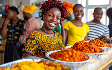 Happy african american community members in colorful attire serve traditional soul food dishes from large bowls at a festive kwanzaa feast with a kinara visible in the background of the warm room.