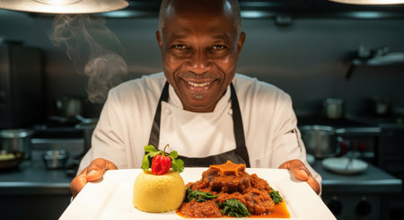 African male chef presenting delicious traditional dish in restaurant kitchen