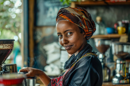 Coffee shop, Portrait of a young African woman in traditional clothes.