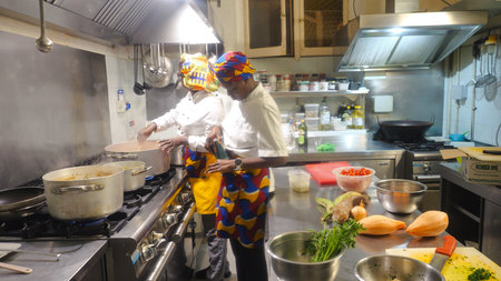 African american couple cooking in a restaurant kitchen. They are wearing traditional clothing.