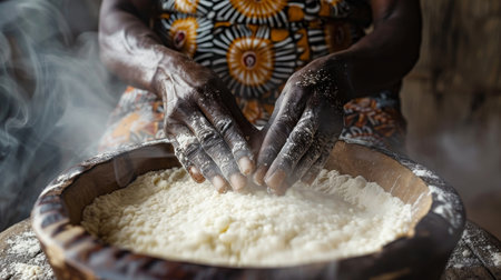 Traditional african fufu preparation in elegant, minimalistic style on white background
