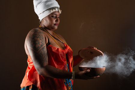 Salvador, Bahia, Brazil - October 21, 2024: Beautiful woman in traditional Candomble clothing, opening clay pot with smoke coming out of it. Salvador, Bahia.