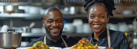 While serving meals in the restaurant, a contented Black cook and her colleague decorate plates.