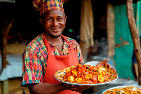 In a bustling market setting, a cheerful chef proudly showcases a colorful platter filled with aromatic traditional dishes.