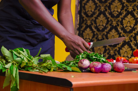 A closeup shot of an African male chef preparing food in front of a yellow wall