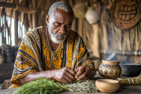 Senior herbalist preparing medicinal herbs inside a traditional African hut
