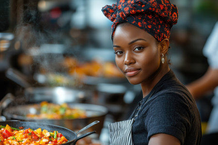 Pretty African Chef Cooking Traditional Healthy Meal in Restaurant Kitchen: A Portrait of Attractive Lady in Authentic African Costume.