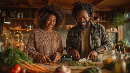 Couple chops vegetables and prepares fresh salad together in warm rustic kitchen. Natural lighting creates inviting atmosphere. Concept of healthy living, culinary activities, relationship bonding.