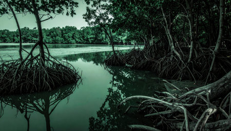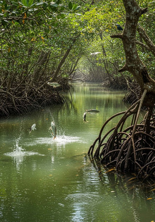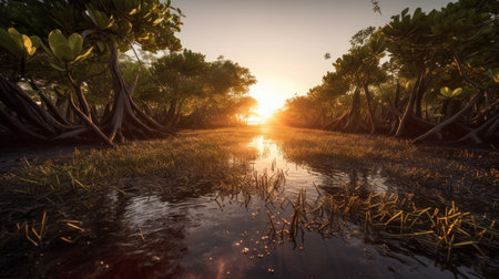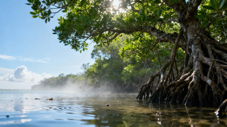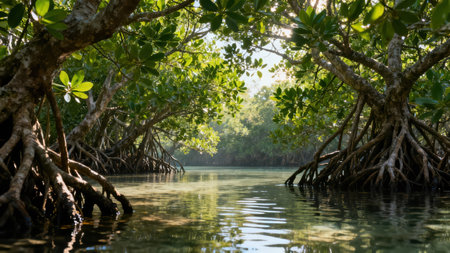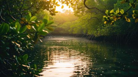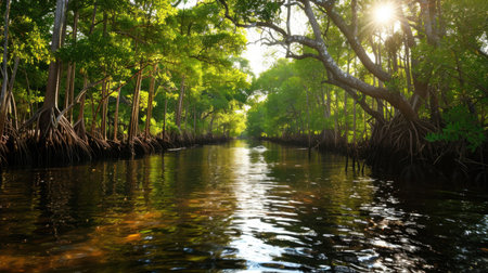 A tranquil mangrove forest scene with sunlight filtering through lush foliage, casting reflections on calm water. Perfect for nature lovers and eco-enthusiasts.