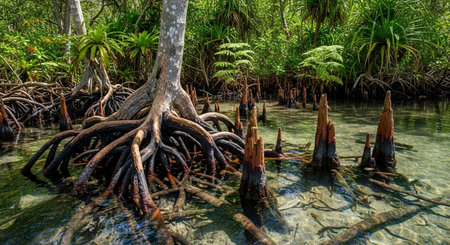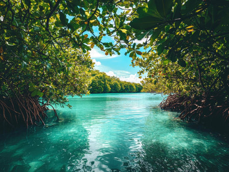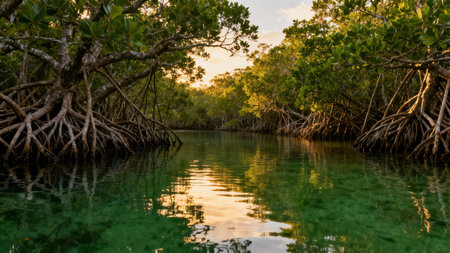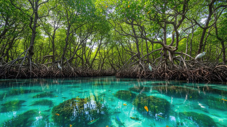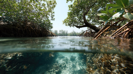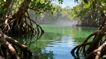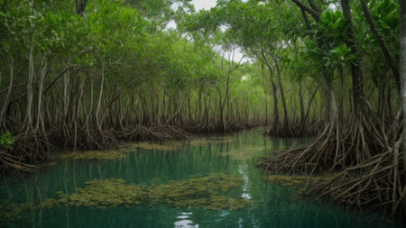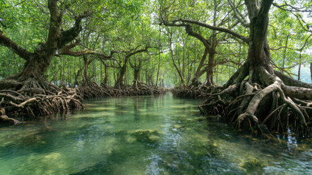 Immerse yourself in a tranquil mangrove forest scene, showcasing lush greenery, winding roots, and clear water, embodying the rich beauty of nature and biodiversity.