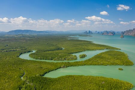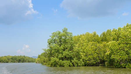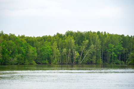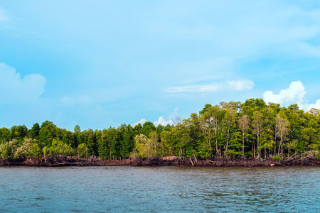 Tropical mangrove forest island river sea against blue sky environmental conserve