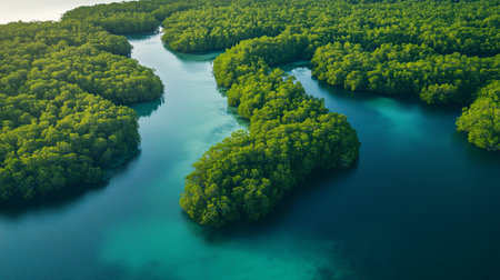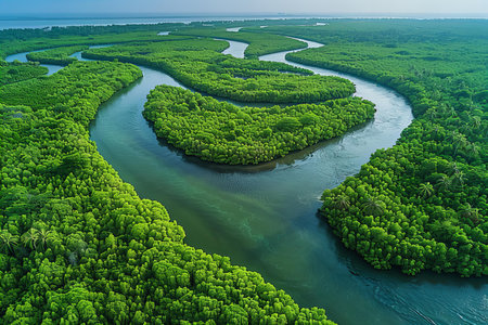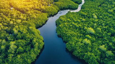 A breathtaking aerial view of a lush mangrove forest lining a winding river as it flows into calm coastal waters. This vibrant landscape captures nature's serenity and beauty.