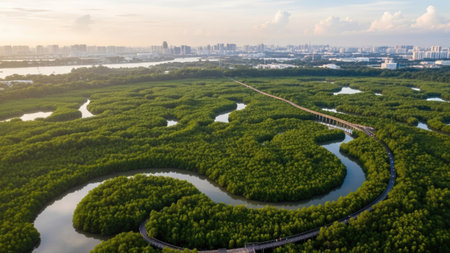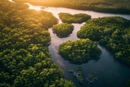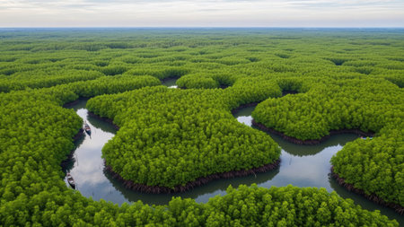 Illustration of bird's-eye view of the mangrove forest, winding river and sea water in green colors. the whole scene is filled with natural beauty. it presents high definition photography. green trees cover the entire landscape, and curved rivers flow through it like ribbons. shot from different an
