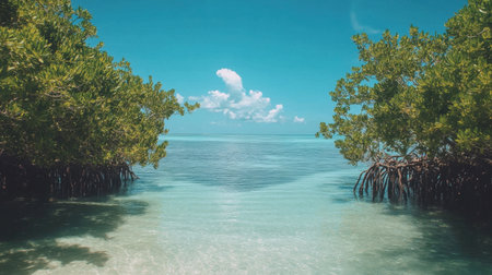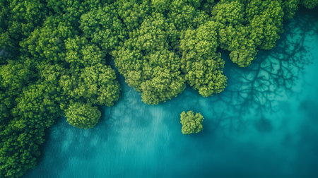 A stunning view showcasing a mangrove habitat, blending lush green trees with crystal clear water, perfect for nature lovers and eco-tourism enthusiasts.