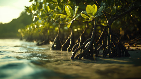 Captivating view of mangrove roots emerging from calm waters, illuminated by warm sunset light, creating a serene and peaceful natural environment.
