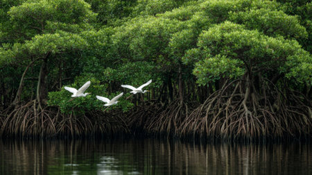 This captivating image showcases a tranquil mangrove forest with vibrant green trees and white birds in flight over calm water, exemplifying peaceful natural beauty.