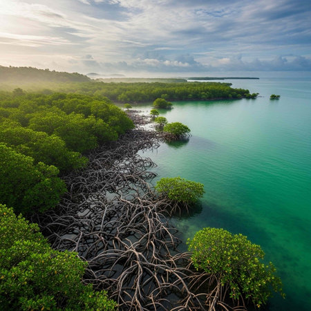 Mangrove forest from above, showing lush greenery and complex root systems stretching into the water, an essential ecosystem in coastal environments.