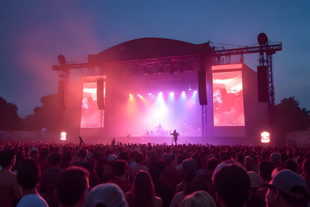 Top view of Crowd of people watching concert, Crowd in open air concert at night with lighting effects, Ai generated