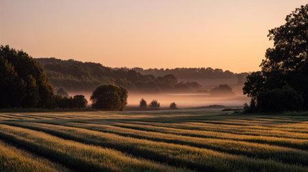 A peaceful sunrise casts a soft glow over misty fields and lush trees. The tranquil rural landscape evokes serenity and natural beauty.