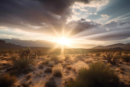 sun shining through the clouds and onto a desert landscape at sunrise, created with generative ai