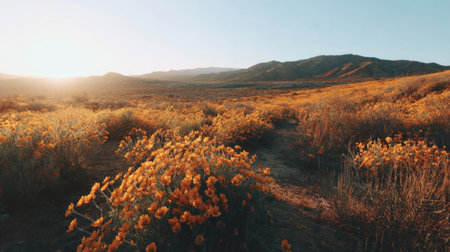 Golden blooms stretch across the desert landscape as the sun sets, creating a peaceful scene filled with warmth and natural beauty.