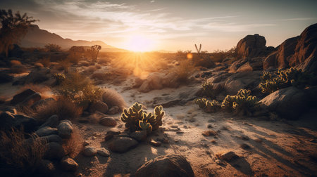 desert with rising sun, casting warm light and shadows onto the landscape, created with generative ai