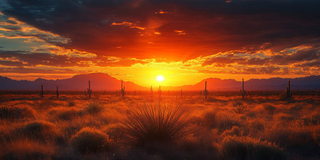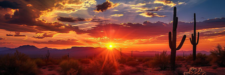 Sunset showing vibrant desert sunset with saguaro cacti silhouetted against a fiery orange and pink sky casting long shadows across the arid...